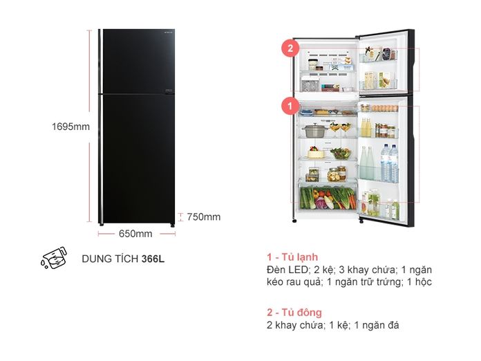 - Dung tích lớn 366L phù hợp cho gia đình 3-5 người
