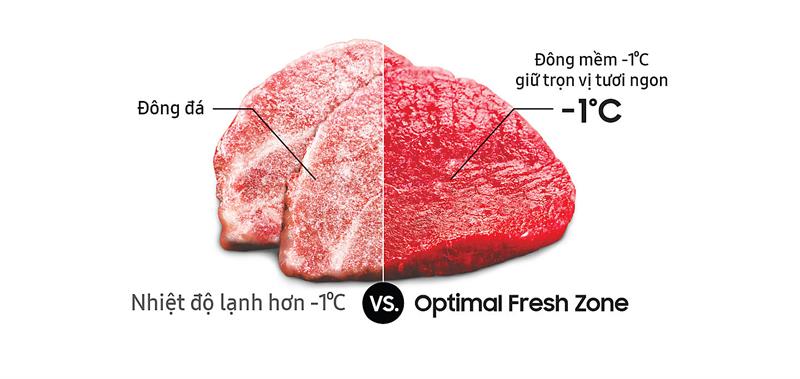 Tủ lạnh Samsung thế hệ mới với ngăn đông mềm Optimal Fresh zone giúp giữ thịt cá tươi ngon, trọn dưỡng chất, hoàn toàn không đông đá ở nhiệt độ đông mềm lý tưởng -1°C .