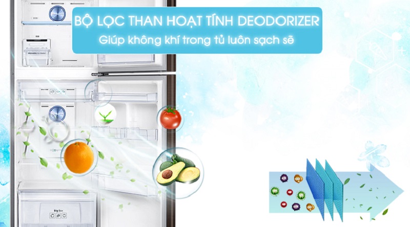 Bộ lọc than hoạt tính Deodorizer được hãng tích hợp vào sẽ loại bỏ các vi khuẩn, bụi bẩn có hại đến sức khỏe của bạn, lọc sạch những mùi hôi khó chịu trả lại sự trong lành cho môi trường bên trong tủ.