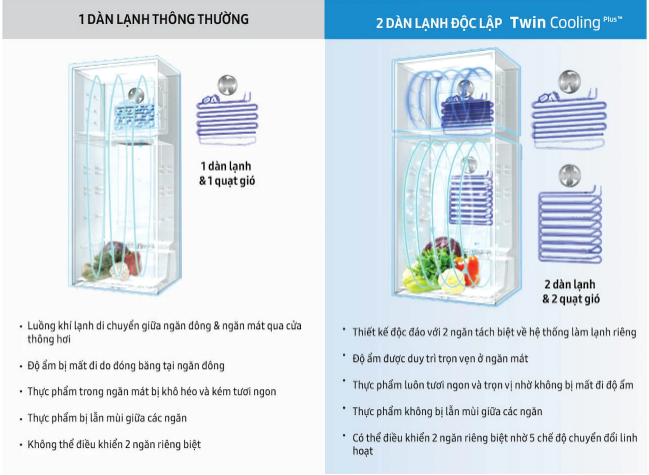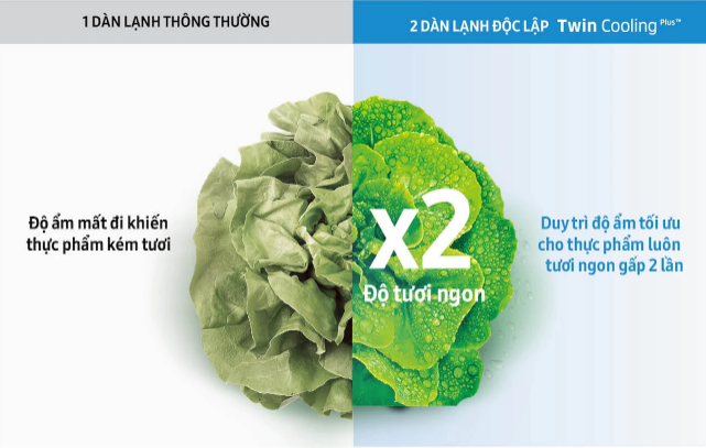 Nhờ hai dàn lạnh hoạt động độc lập, hai ngăn tủ của tủ lạnh Twin Cooling Plus hoàn toàn tách biệt, ngăn việc mất độ ẩm từ ngăn mát sang ngăn đông do sự trao đổi khí giữa hai ngăn, giữ độ ấm tối ưu, giúp thực phẩm tươi ngon lâu hơn gấp 2 lần.