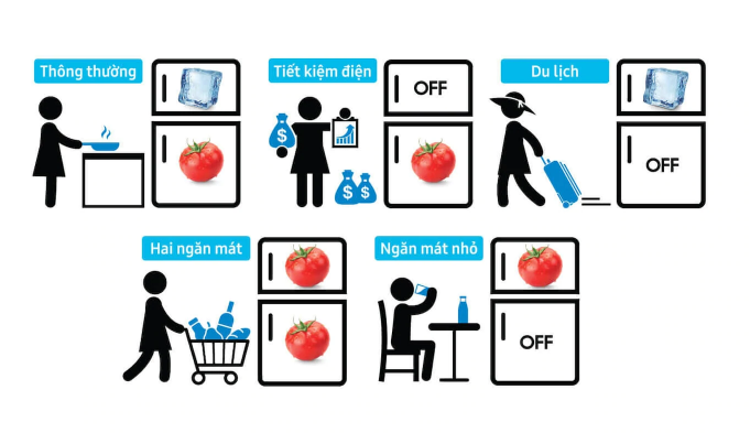 Với công nghệ 2 dàn lạnh độc lập duy nhất chỉ có tủ lạnh Samsung cho phép người dùng linh hoạt sử dụng một trong 5 chế độ tùy theo nhu cầu. Chuyển đổi ngăn đông thành ngăn mát thêm không gian lưu trữ (chế độ Hai ngăn mát) hoặc tắt hẳn một trong hai ngăn để tiết kiệm điện năng khi không có nhu cầu sử dụng (chế độ Tiết kiệm điện, Du lịch, Ngăn mát nhỏ).