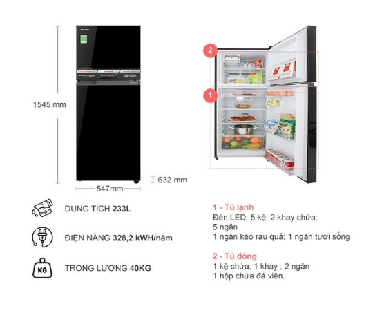 - Dung tích tổng: 233 lít