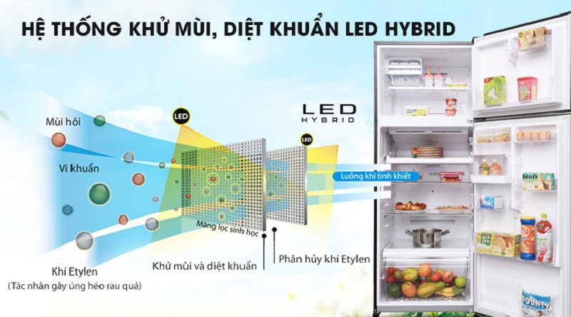 Nhờ kết hợp công nghệ Led Hybrid hỗ trợ kháng khuẩn, khử mùi hôi bên trong tủ lạnh hiệu quả hơn so với thông thường, giúp thực phẩm của bạn được bảo quản lâu hơn, tươi ngon và bảo vệ cho sức khỏe gia đình của bạn.
