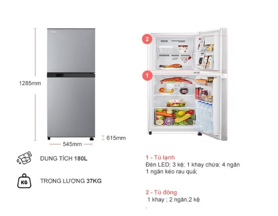 - Dung tích 180L phù hợp gia đình từ 2 - 4 thành viên