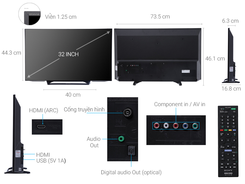 Tivi Sony 32 inch cũng được thiết kế tinh tế, thanh mảnh nhưng không kém phần chắc chắn, giúp tivi đứng vững vàng.