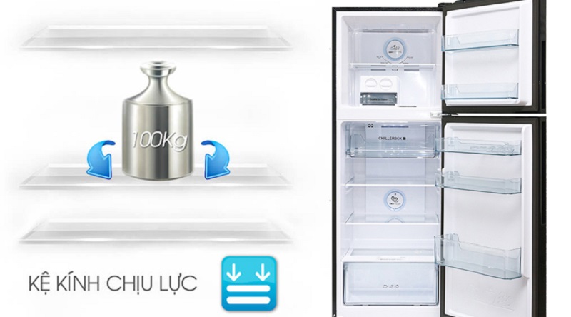 Khay chứa bên trong của chiếc tủ lạnh inverter này có khả năng chịu lực cực lớn, nhờ được chế tạo từ những tấm kính chịu lực bền bỉ, đảm bảo an toàn cho bạn trong quá trình sử dụng.