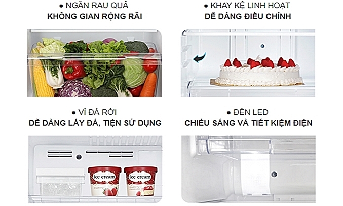 Tủ lạnh Toshiba Inverter 253 lít GR-B31VU (UKG) còn có vỉ đá rời giúp dễ dàng lấy đá, đèn LED chiếu sáng tiết kiệm điện, ngăn rau quả có không gian lưu trữ rộng rãi và khay kệ linh hoạt dễ dàng điều chỉnh.